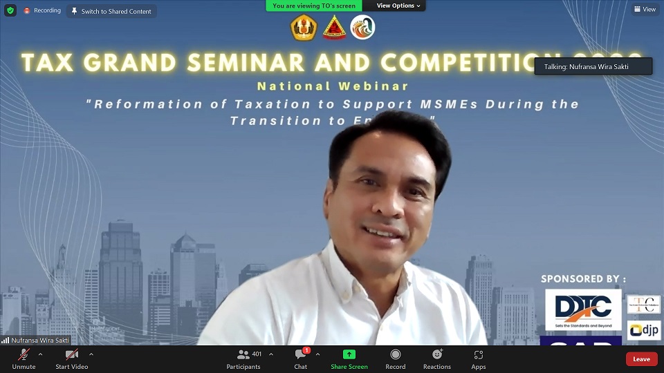 “Pemerintah melalui Kementerian Keuangan terus mendukung Usaha Mikro Kecil Menengah (UMKM) antara lain dengan Undang-Undang Harmonisasi Peraturan Perpajakan (UU HPP) di mana Wajib Pajak Orang Pribadi dengan pendapatan bruto kurang dari Rp500 juta setahun dibebaskan dari pembayaran pajak,” ujar Staf Ahli Menteri Keuangan Bidang Pengawasan Pajak Nufransa Wira Sakti di acara webinar nasional yang diselenggarakan oleh Universitas Padjajaran secara daring (Sabtu, 16/11).