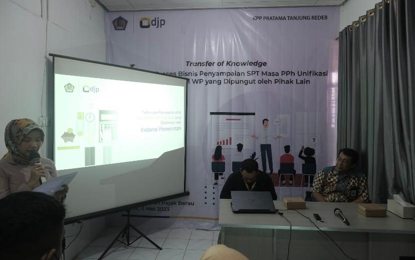 Al Jaber Muqorrobin Hujjah, salah satu pemateri memberikan pemaparan materi mengenai regulasi dan proses bisnis penyampaian Surat Pemberitahuan (SPT) Masa Pajak Penghasilan (PPh) Unifikasi dan SPT Masa bagi wajib pajak yang dipungut oleh pihak lain dalam kegiatan ini.