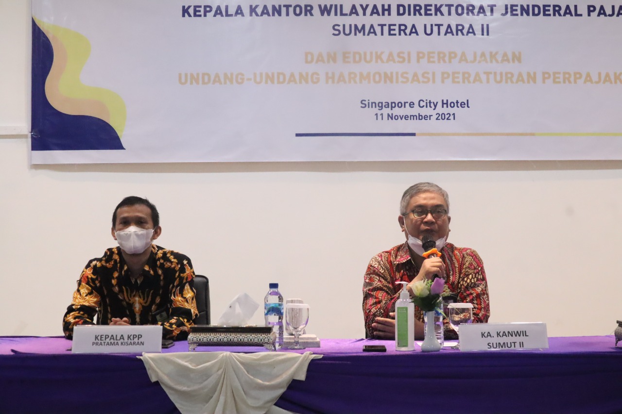 Kantor Pelayanan Pajak (KPP) Pratama Kisaran menyelenggarakan kegiatan bertajuk "Dialog Perpajakan Bersama Kepala Kantor Wilayah (Kanwil) Direktorat Jenderal Pajak (DJP) Sumatera Utara II dan Edukasi Perpajakan Undang-Undang Harmonisasi Peraturan Perpajakan" di aula Singapore City Hotel, Kecamatan Sei Balai, Kabupaten Batubara (Kamis, 11/11).