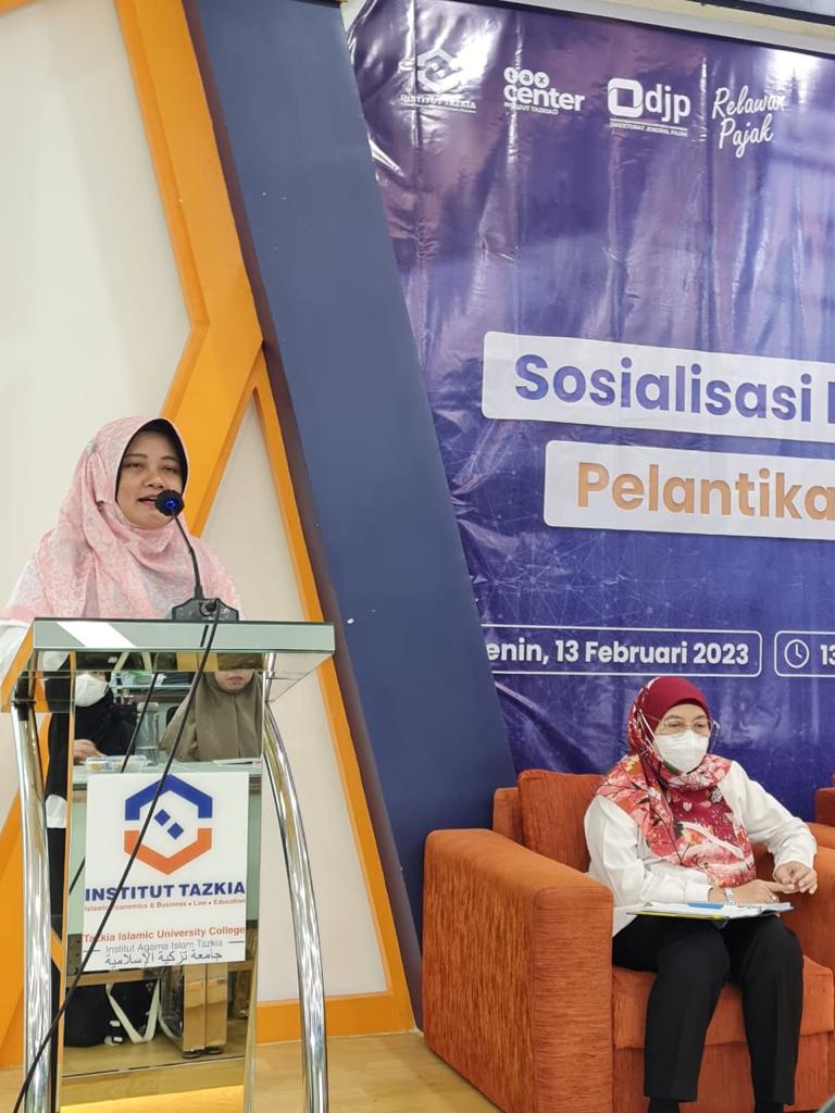 Penyuluh Pajak Kantor Wilayah (Kanwil) Direktorat Jenderal Pajak (DJP) Jawa Barat III Ika Kartini Aulia dan Lala Krisnalia berikan pelatihan kepada 37 Relawan Pajak Institut Agama Islam (IAI) Tazkia di Kampus IAI Tazkia Sentul, Bogor (Senin, 13/2). Pelatihan mengenai cara pelaporan Surat Pemberitahuan (SPT) Tahunan dan pemadanan Nomor Induk Kependudukan (NIK) menjadi Nomor Pokok Wajib Pajak (NPWP) diberikan usai pelantikan relawan pajak.