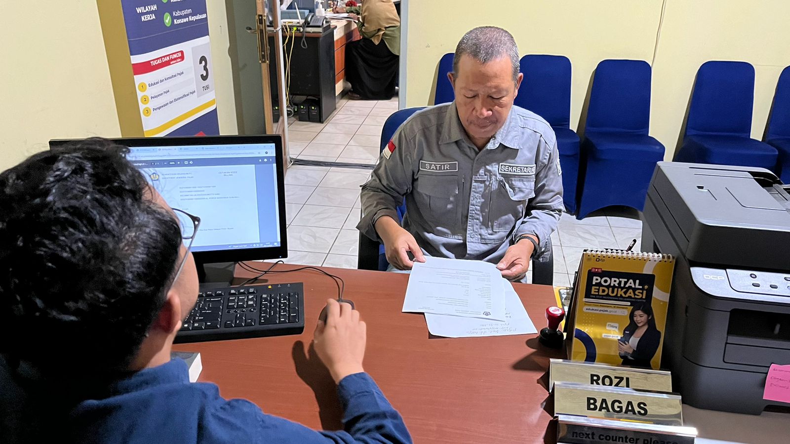 Satu wajib pajak instansi pemerintah di Kabupaten Konawe melakukan kunjungan ke Kantor Pelayanan, Penyuluhan, dan Konsultasi Perpajakan (KP2KP) Unaaha di Jalan Diponegoro, Kelurahan Tuoy, Kecamatan Unaaha, Kabupaten Konawe (Kamis, 28/11). Kunjungan instansi pemerintah ini diterima oleh Petugas KP2KP Unaaha Satriawan yang sedang melaksanakan piket helpdesk.