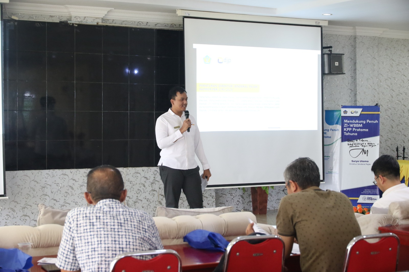 Kantor Pelayanan Pajak (KPP) Pratama Tahuna melakukan kegiatan sosialisasi terkait Peraturan Direktur Jenderal Pajak Nomor PER-2/PJ/2024 kepada Wajib Pajak Badan yang berada di lingkungan Kab. Kepulauan Sangihe, Sulawesi Utara (Senin, 24/6). Acara tersebut dilakukan di Aula KPP Pratama Tahuna dan diadakan selama dua hari, mulai tanggal 24-25 Juni 2024. . Kegiatan tersebut bertujuan untuk mensosialisasikan peraturan terkait tata cara pembuatan bukti pemotongan PPh 21 dan/atau PPh 26.
