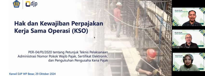 “Sesuai PER-04/PJ/2020 Kerja Sama Operasi (Joint Operation) adalah pengaturan bersama antar para pihak yang mengatur bahwa para pihak yang disebut operator bersama memiliki pengendalian bersama atau memiliki hak atas aset, dan kewajiban terhadap liabilitas, yang melakukan penyerahan dan/atau memperoleh barang dan/atau jasa atas nama Kerja Sama Operasi (Joint Operation),” jelas Didy, Penyuluh Pajak Kanwi DJP Wajib Pajak Besar.