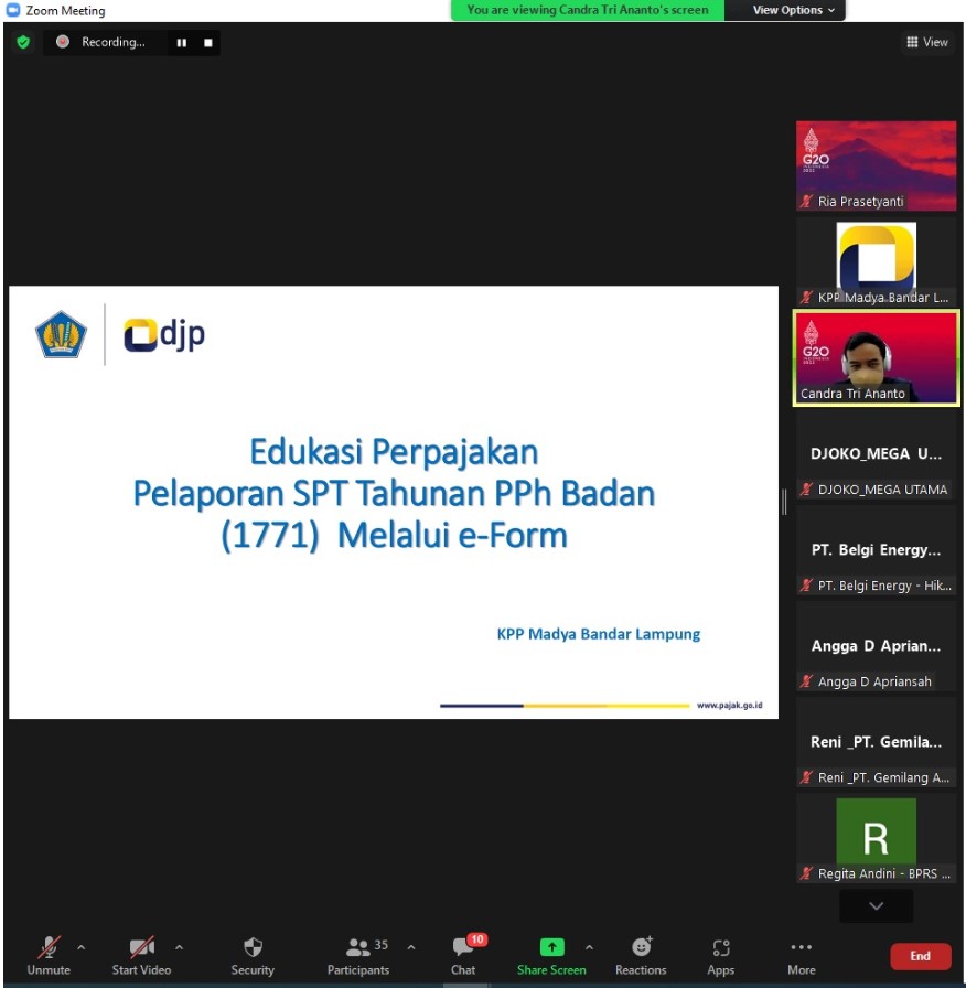 Kegiatan yang dimulai pada pukul 09.00 WIB ini dibuka dengan penyampaian informasi mengenai pelaporan SPT Tahunan PPh Badan (1770) menggunakan e-Form. Kegiatan kelas pajak berlangsung selama kurang lebih dua jam melalui zoom meeting webinar. Penyuluh Pajak KPP Madya Bandar Lampung Ria Prasetyanti dan Candra Tri Ananto menjadi narasumber dalam kegiatan kelas pajak ini. Meskipun di Bulan Ramadan, antusiasme wajib pajak terlihat dari banyaknya wajib pajak yang mengikuti kegiatan kelas pajak. Sebanyak 35 perwakilan Wajib Pajak Badan menyimak tata cara pelaporan SPT Tahunan PPh Badan melalui e-Form yang disampaikan oleh narasumber.