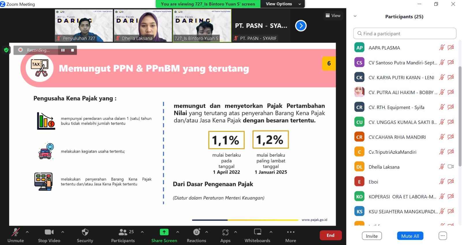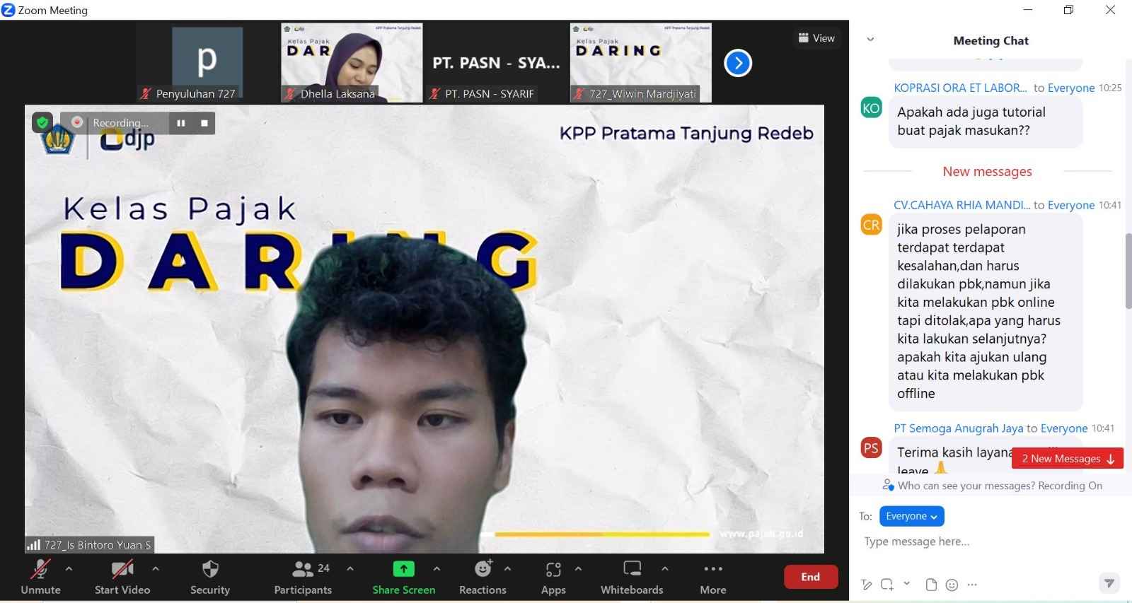 Sebanyak 17 Wajib Pajak Badan menjadi peserta Sosialisasi Kewajiban Pengusaha Kena Pajak (PKP) di mana acara tersebut diadakan oleh Kantor Pelayanan Pajak (KPP) Pratama Tanjung Redeb secara daring melalui aplikasi Zoom Meeting di Kota Tarakan (Kamis, 10/8). Acara tersebut dipandu oleh Pelaksana Seksi Pelayanan KPP Pratama Tanjung Redeb Dhella Laksana selaku pembawa acara serta terkait materi disampaikan oleh Asisten Penyuluh KPP Pratama Tanjung Redeb Is Bintoro Yuan Saputro serta Irvan Ugaharisto Selladepa.
