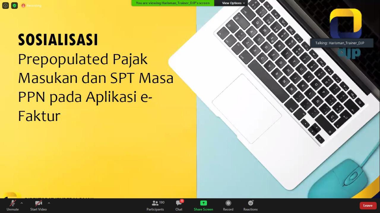 Kanwil DJP Wajib Pajak Besar mengadakan webinar (seminar web) sosialisasi dan bimbingan teknis pajak masukan dan prepulated SPT masa PPN pada aplikasi e-Faktur melalui media Zoom Meeting yang dilangsungkan di Kanwil DJP Wajib Pajak Besar (Selasa, 30/06). Dalam dua hari pelaksanannya sejak Senin, 29 Juni, kegiatan ini dibagi menjadi empat sesi dengan dihadiri sekitar 200 partisipan Wajib Pajak KPP Wajib Pajak Besar setiap sesinya.