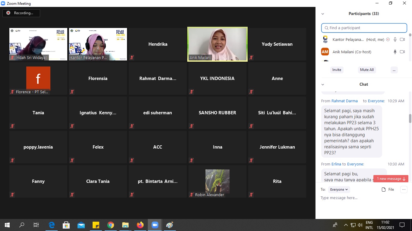Kantor Pelayanan Pajak (KPP) Pratama Cikupa kembali mengadakan kelas pajak mengenai insentif pajak yang diselenggarakan melalui aplikasi Zoom Meeting bersama 50 Wajib Pajak Badan dan Orang Pribadi di Banten (Senin, 15/2).