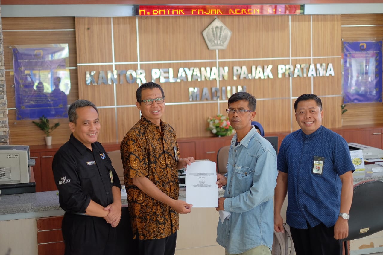 Sebagai bentuk apresiasi, Kepala KPP Pratama Madiun Santoso Dwi Prasetyo memberikan suvenir dan mengucapkan terimakasih kepada Riwanto atas komitmennya karena telah menjalankan kewajiban perpajakannya di awal waktu.