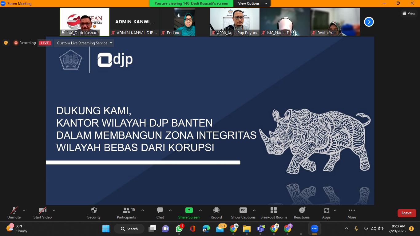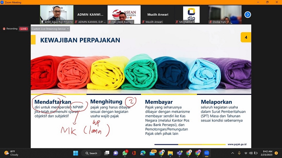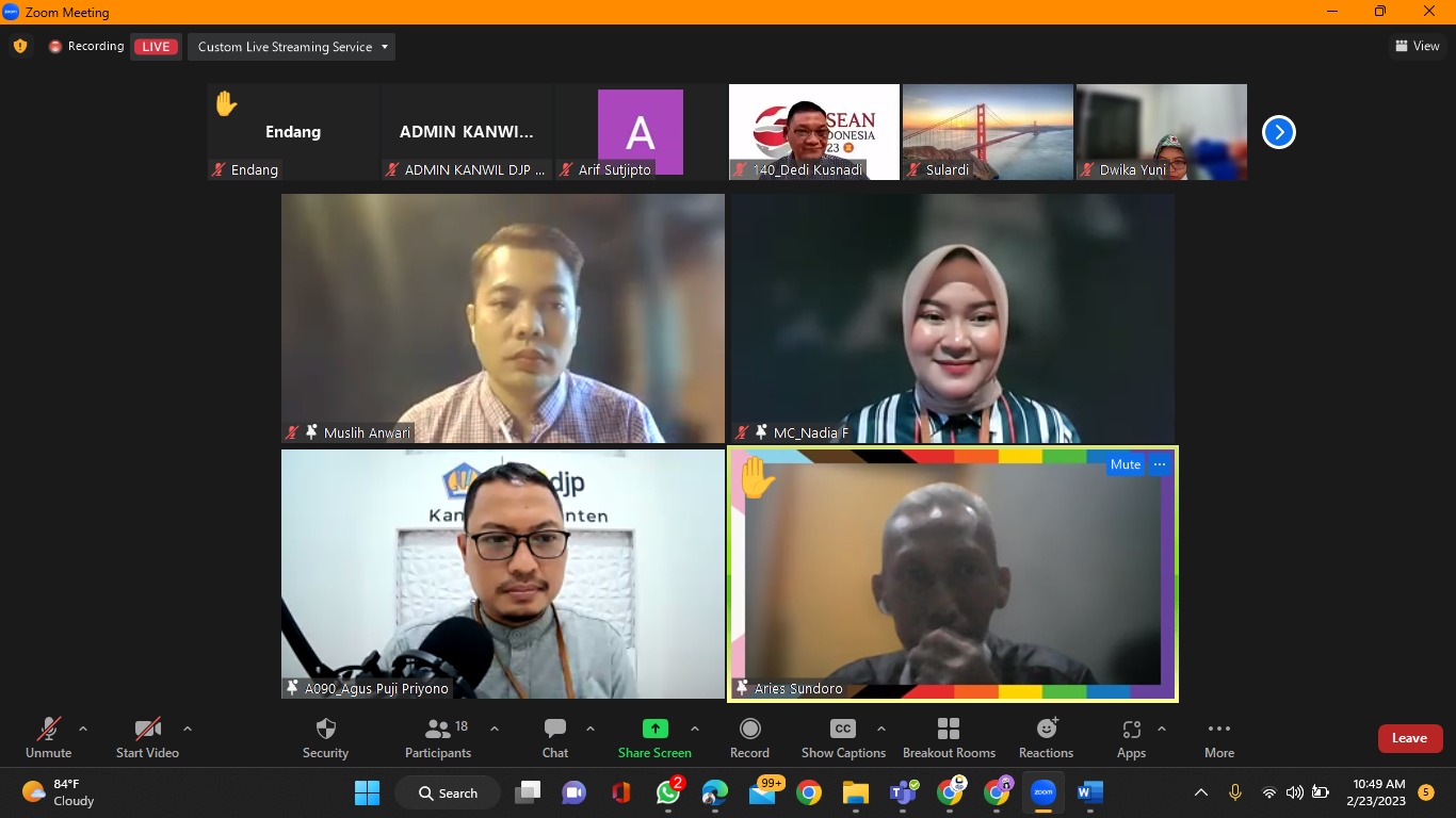 Kantor Wilayah Direktorat Jenderal Pajak (DJP) Banten menyelenggarakan kegiatan acara sosialisasi pelaporan Surat Pemberitahuan (SPT) Tahunan Usaha Mikro Kecil dan Menengah (UMKM) Orang Pribadi Tahun 2022 dengan e-Filing secara daring melalui aplikasi Zoom Cloud Meeting di Kota Serang, Banten (Kamis, 23/2).