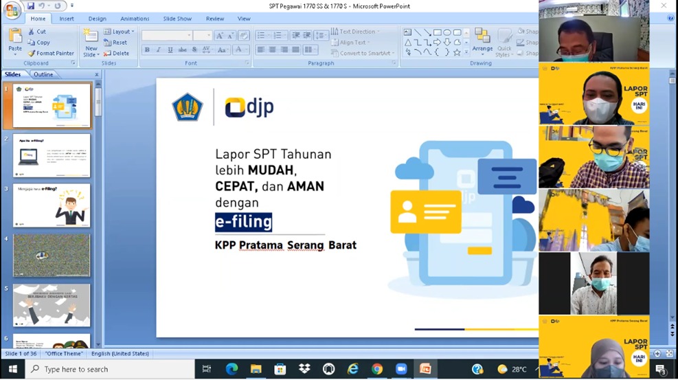 Kantor Pelayanan Pajak (KPP) Pratama Serang Barat melaksanakan kegiatan Kelas Pajak Pelaporan SPT Tahunan untuk pegawai di seluruh lingkungan Instansi Vertikal Kota Serang secara online melalui aplikasi Zoom Cloud Meeting dari KPP Pratama Serang Barat, Kota Serang (Kamis, 17/02).