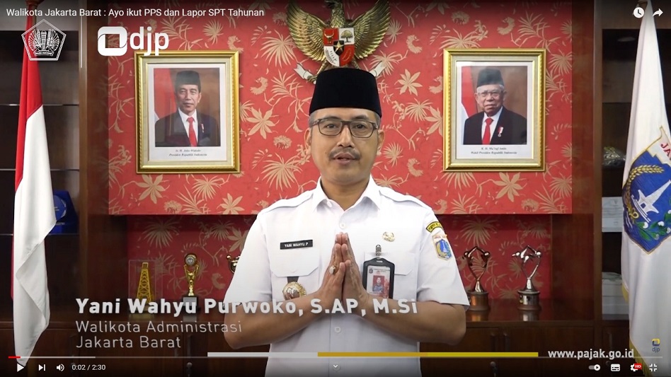 Wali Kota Administrasi Jakarta Barat Yani Wahyu Purwoko menyampaikan ajakan kepada warga Jakarta Barat untuk berpartisipasi dalam menyukseskan seluruh program penanganan Covid-19 dengan cara membayar pajak tepat waktu untuk kesejahteraan bersama. Hal ini disampaikannya melalui rekaman video di Kantor Wali Kota Administrasi Jakarta Barat yang diunggah dalam kanal YouTube Kantor Wilayah Direktorat Jenderal Pajak (Kanwil DJP) Jakarta Barat (Kamis, 17/3). Tayangan video tersebut juga dapat disaksikan melalui Instagram resmi Kanwil DJP Jakarta Barat @pajakjakbar dan Instagram resmi Kota Administrasi Jakarta Barat @kotajakartabarat.