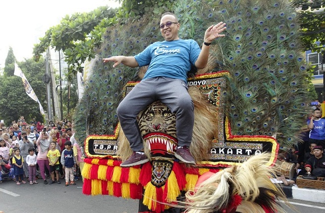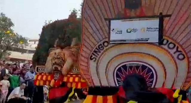 Puncak pertunjukkan Reog dalam peringatan Hari Pajak di CFD Kota Bekasi menjadi semakin meriah ketika Ibu Catur dan Bapak Yoyok manaiki kepala Dadak Merak yang menggambarkan semangat dan tekad kuat kedua Kanwil tersebut untuk bekerja keras mengejar target penerimaan pajak sampai di posisi puncak capaian, yaitu melebihi 100%.