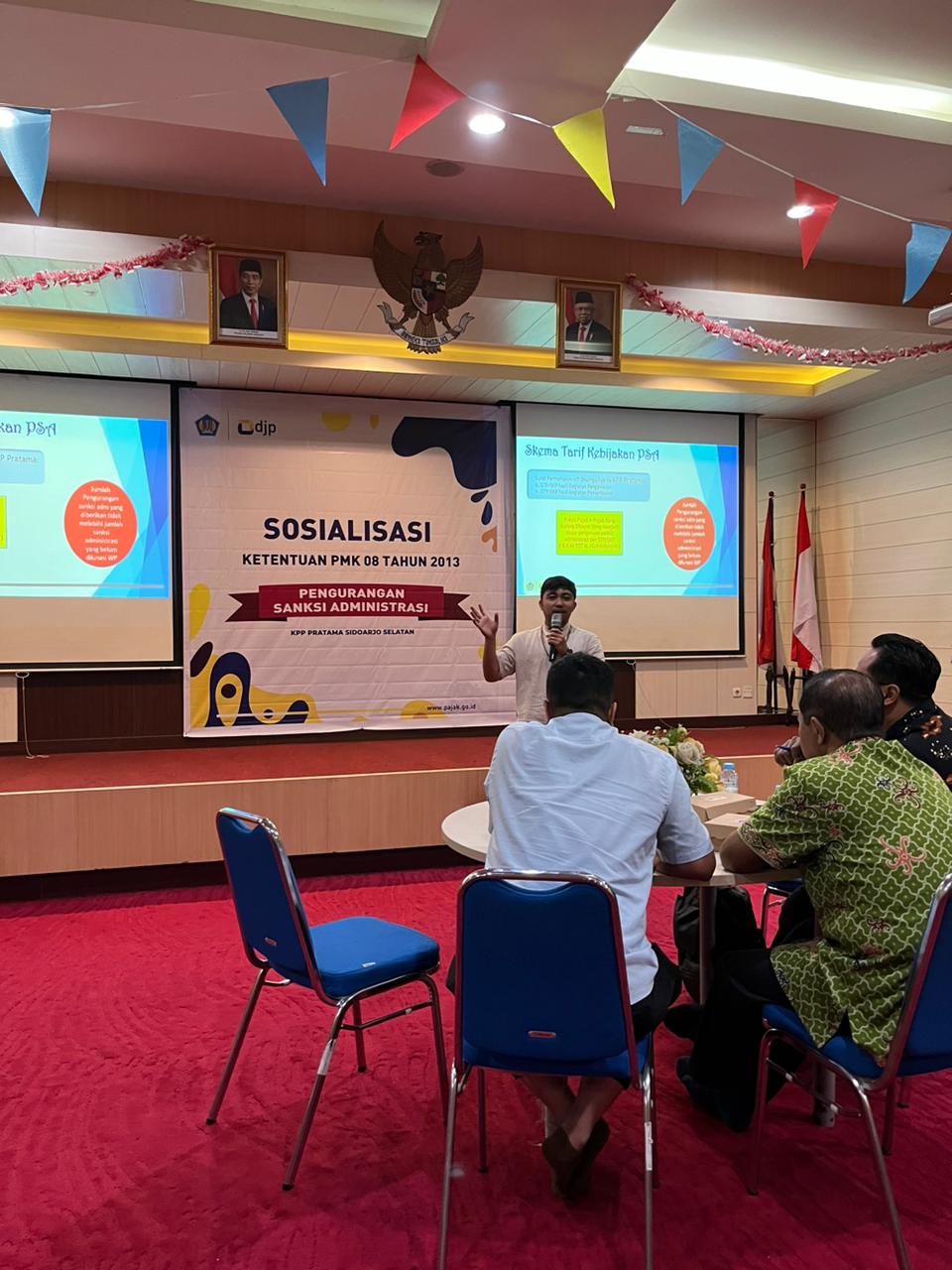 KPP Pratama Sidoarjo Selatan menggelar Sosialisasi Program Pengurangan Sanksi Administrasi (PSA) Tahun 2023 kepada Wajib Pajak yang berpotensi untuk mengikuti program ini. Sebanyak 20 wajib pajak prioritas, baik wajib pajak orang pribadi maupun badan menghadiri acara Sosialisasi tersebut yang bertempat di Aula KPP Pratama Sidoarjo Selatan (Kamis, 14/9).