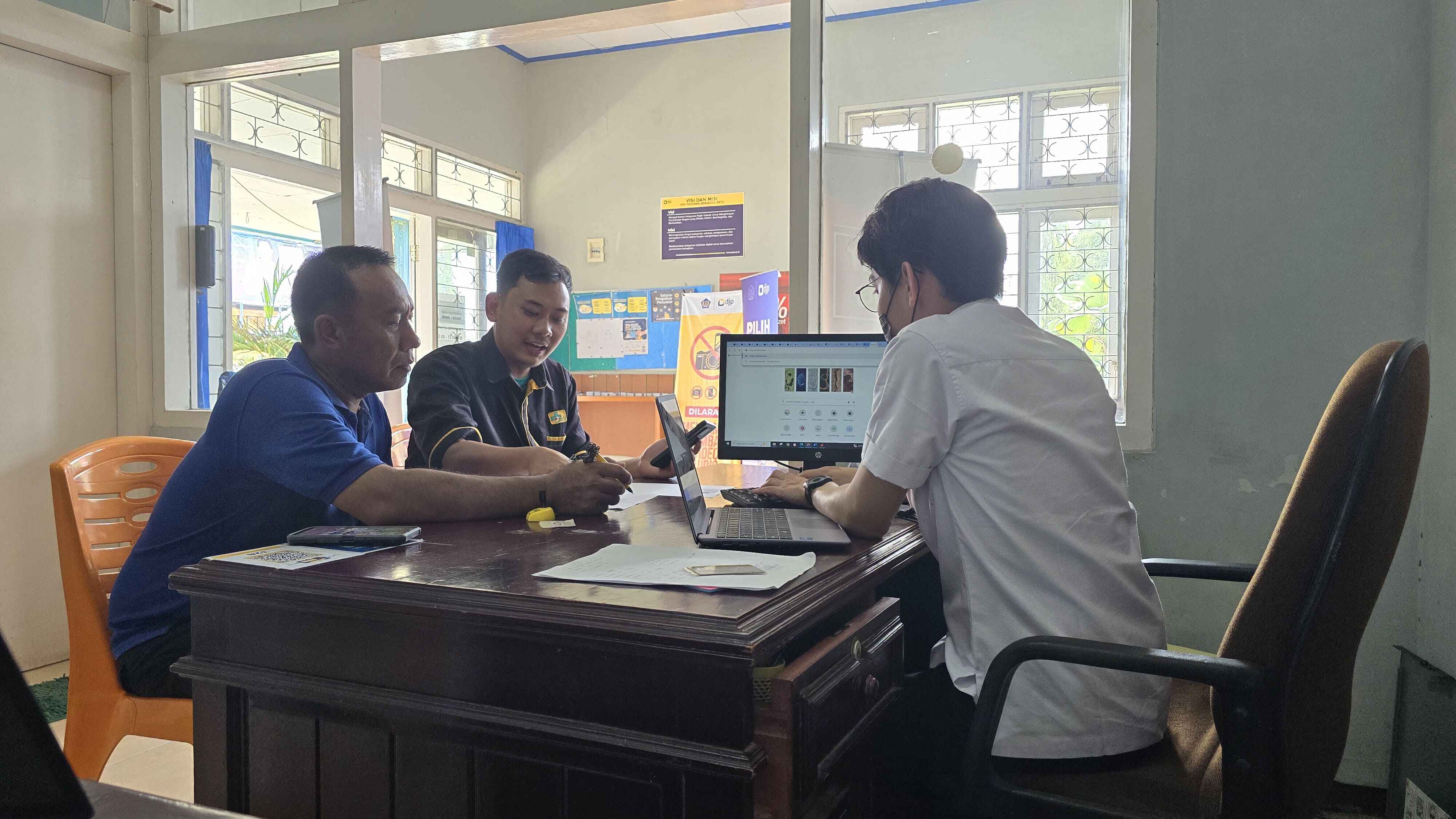 Wajib pajak memadati Pos Pelayanan Pajak Arga Makmur, Bengkulu Utara, pada hari Senin (22/4). Beberapa wajib pajak memanfaatkan momen ini untuk memadankan Nomor Induk Kependudukan (NIK) dengan Nomor Pokok Wajib Pajak (NPWP) mereka. Salah satu wajib pajak yang melakukan pemadanan NIK-NPWP adalah Marzan Efendi, seorang karyawan di Rumah Sakit Charitas Arga Makmur.