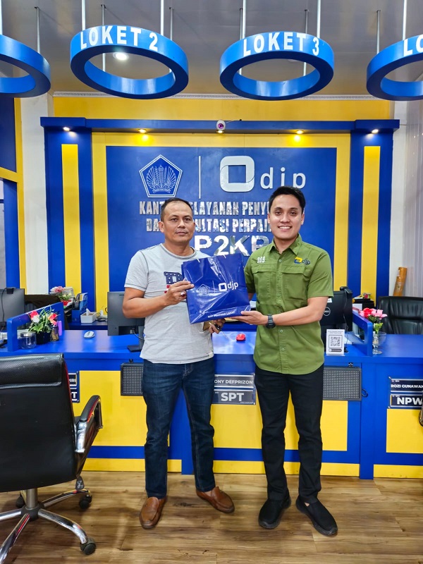 Sebagai bentuk Apresiasi, Dony memberikan souvenir kepada Maryadi atas inisiatifnya sebagai wajib pajak untuk melaporkan SPT Tahunan lebih awal.