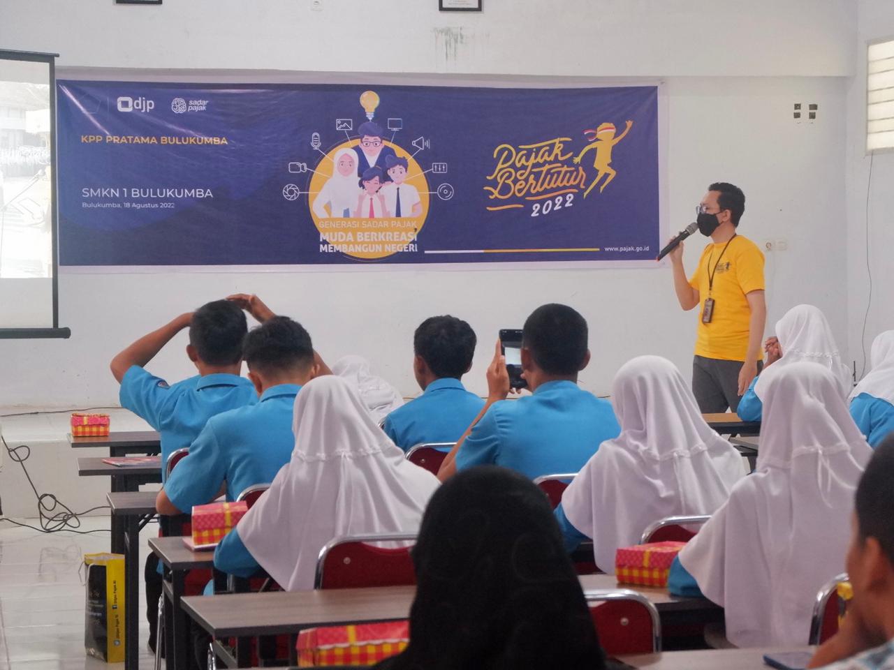 Kantor Pelayanan Pajak (KPP) Pratama Bulukumba menyelenggarakan kegiatan Pajak Bertutur 2022 dengan tema "Generasi Sadar Pajak, Muda Berkreasi Membangun Negeri". Kegiatan Pajak Bertutur 2022 ini diadakan di Sekolah Menengah Kejuruan (SMK) Negeri 1 Bulukumba (Kamis, 18/08).