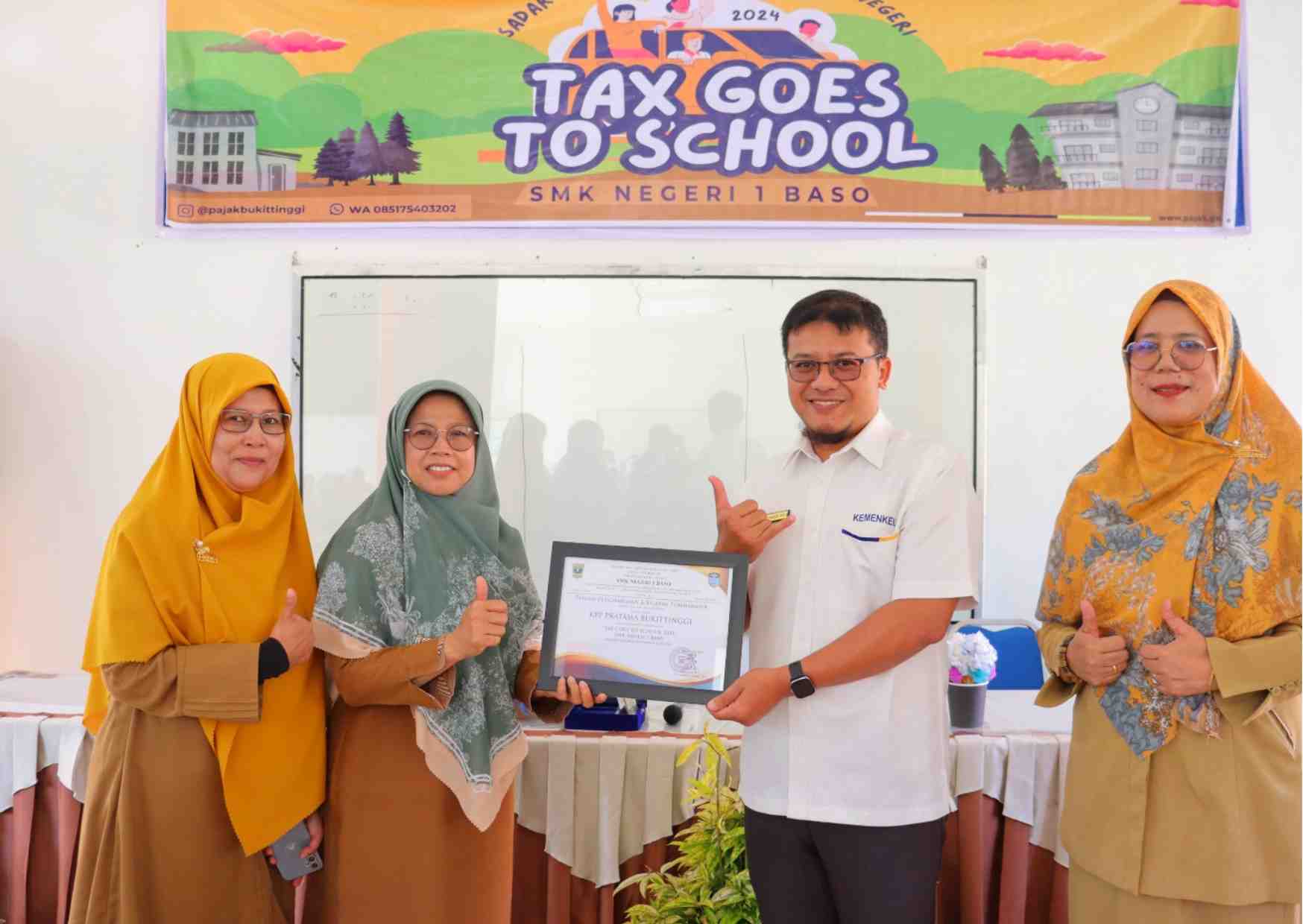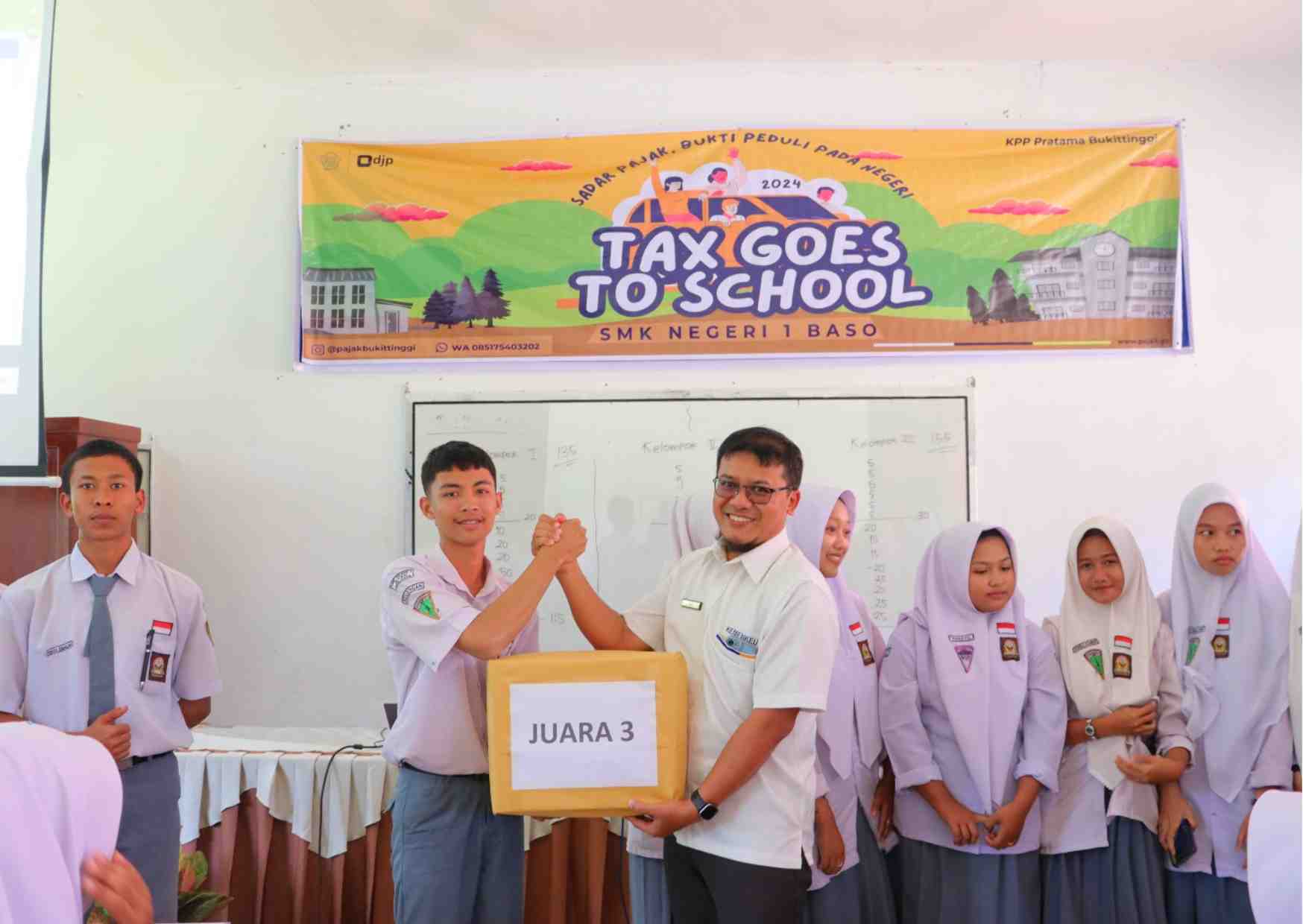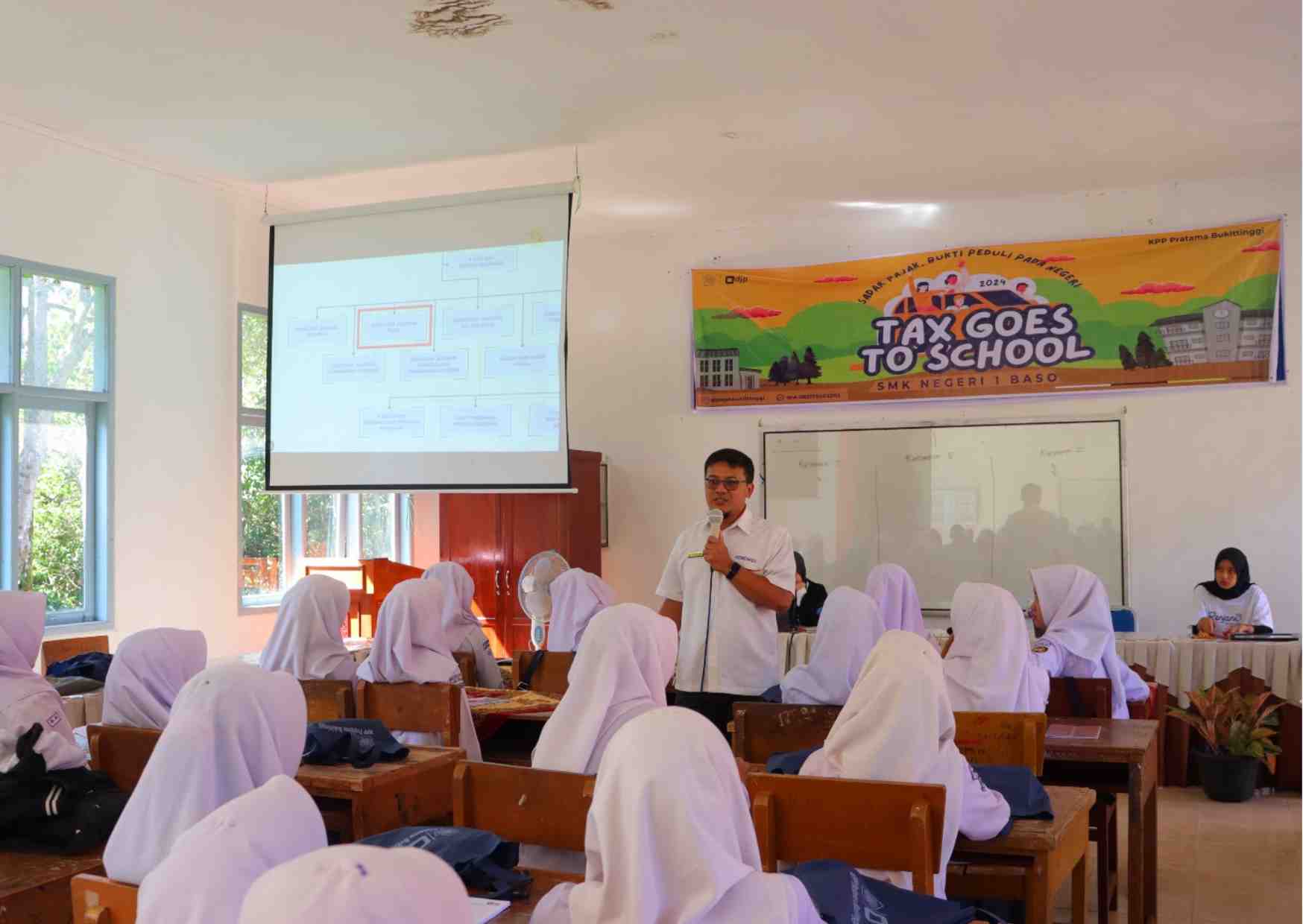 Kantor Pelayanan Pajak (KPP) Pratama Bukittinggi menyelenggarakan kegiatan Tax Goes to School (TGTS) 2024 dalam rangka mengenalkan pajak sejak dini bagi pelajar khususnya di wilayah Kabupaten Agam. Kegiatan ini dilaksanakan secara luring di Sekolah Menengah Kejuruan (SMK) Negeri 1 Baso (Senin, 22/07). Kegiatan TGTS mengusung tema "Sadar Pajak, Bukti Peduli pada Negeri"