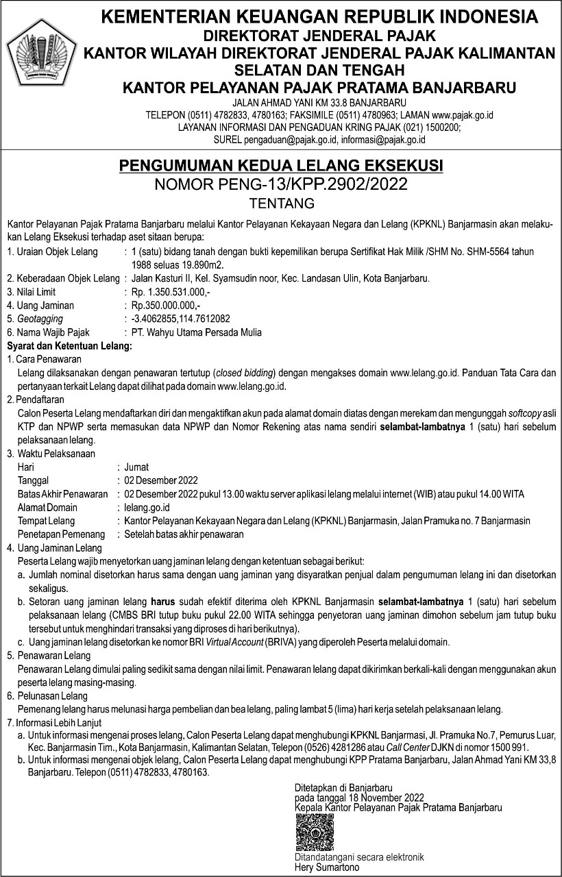 TERKAIT OBJEK LELANG, HUBUNGI KPP BANJARBARU (0511) 4782833, 4780163