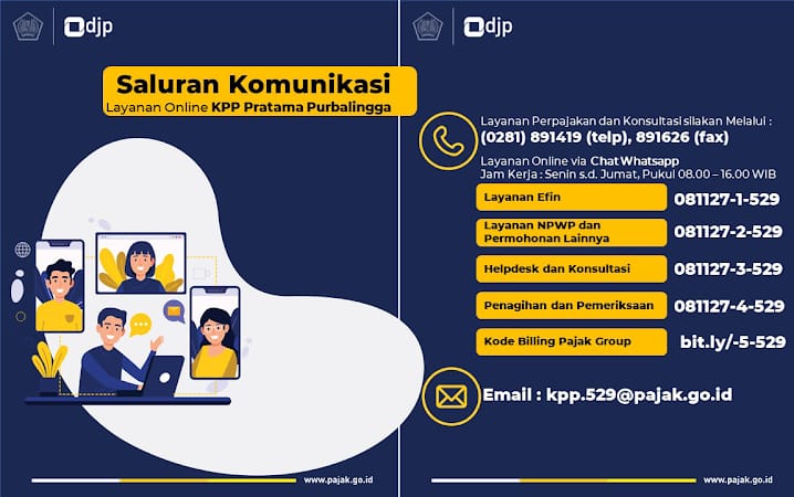 Sejak 1 Januari 2022, untuk meningkatkan pelayanan kepada masyarakat Kabupaten Purbalingga, KPP Pratama Purbalingga melakukan perubahan nomor saluran komunikasi yang dapat dihubungi melalui Chat Whatsapp.