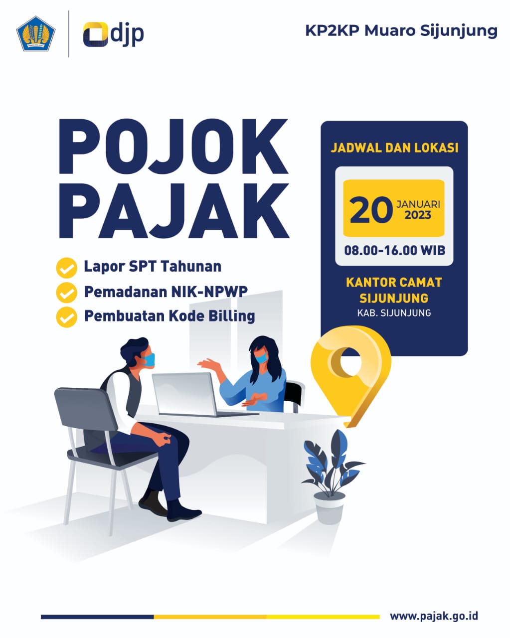 Untuk membantu pengisian SPT Tahunan, kami membuka *Pojok Pajak* yang diselenggarakan oleh KP2KP Muaro Sijunjung pada: