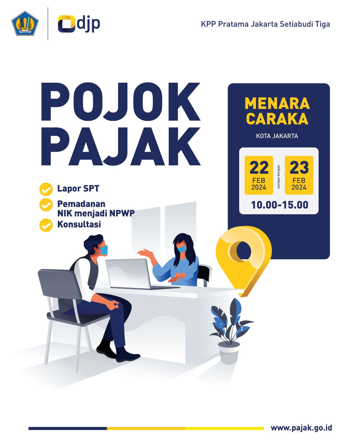 Pojok Pajak KPP Pratama Jakarta Setiabudi Tiga tanggal 22-23 Februari 2024 mulai pukul 10.00 - 15.00 WIB.